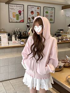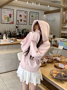 【工厂直销】粉色拉链连帽卫衣外套女慵懒宽松木耳边长袖上衣开衫