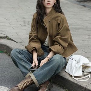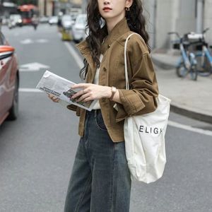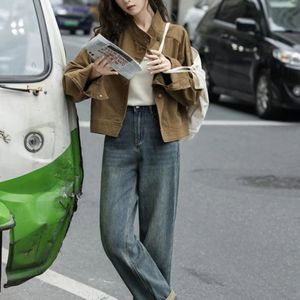 2025新款复古咖色牛仔外套女早春秋小众宽松立领工装夹克上衣外穿