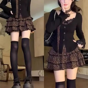 纯欲甜辣妹套装裙女早秋季假两件蕾丝豹纹上衣穿搭蛋糕裙子两件套