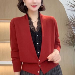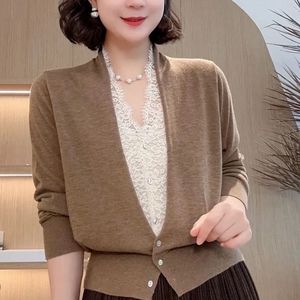 春季毛衣新款拼接气质韩版开衫蕾丝长袖宽松针织外套针织衫上衣女