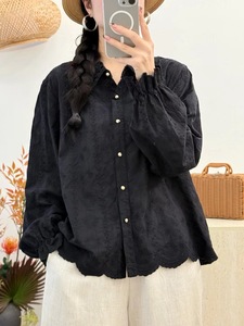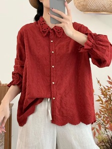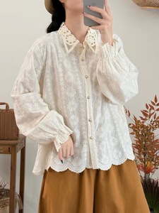 新品简约清新蕾丝翻领宽松百搭刺绣长袖衬衫