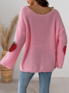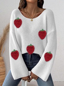 女士套头毛衫跨境欧美女装草莓立体拼接宽松一字领露肩喇叭袖毛衣