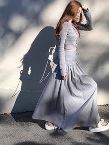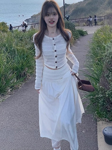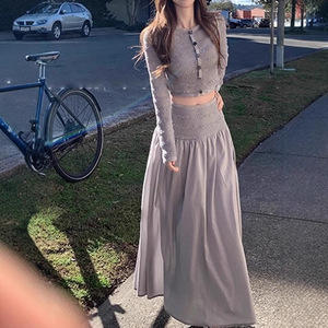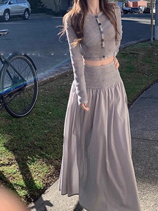 私享时刻 条纹针织上衣长半裙休闲两件套装女2025秋新款 一件代发
