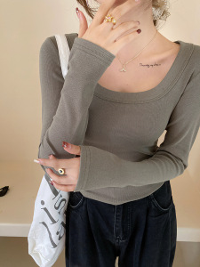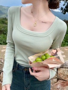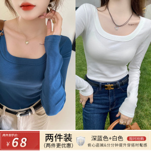蓝色方领打底衫女装内搭2025新款春夏季正肩显瘦修身长袖恤上衣