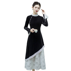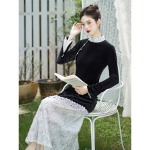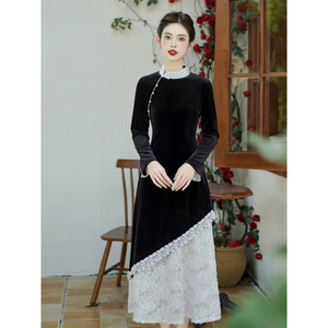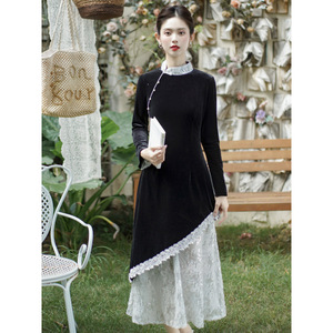 新中式复古蕾丝拼接假两件立领旗袍秋冬国风黑色丝绒连衣裙高级感
