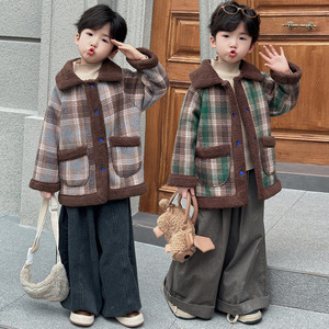 新款儿童外套男女童秋冬加绒加厚保暖中大童韩版格子上衣外穿童装