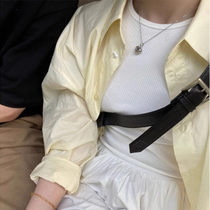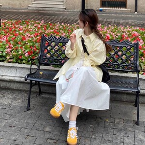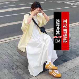 日系奶黄色长袖衬衫女春秋小个子宽松衬衣外搭开衫外套中长款上衣