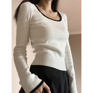 设计感小众正肩长袖上衣恤女春秋季薄款修身白色内搭针织打底衫