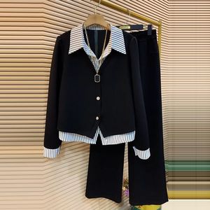 大码胖春秋季新款条纹衬衫领假两件单排扣上衣阔腿裤显瘦两件套年