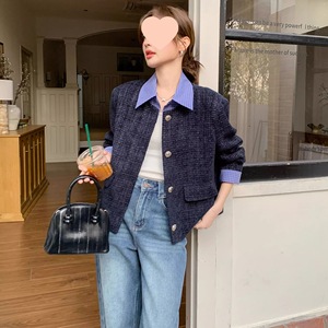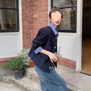 藏青色设计感格纹拼接小香风外套女2025早春新款时髦洋气设计上衣
