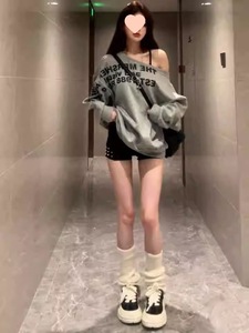 美式斜肩字母设计感长袖卫衣女新款辣妹慵懒风宽松春秋季上衣