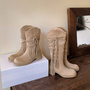 2025秋冬上新埃及靴~流苏粗跟中高筒长靴西部牛仔靴女堆堆瘦瘦靴