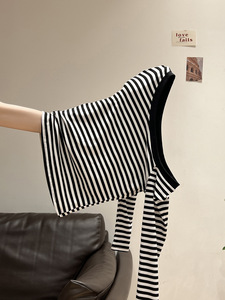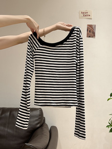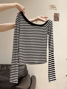 黑白条纹斜角肩长袖恤女2025春秋别致绝美辣妹风修身一字肩上衣
