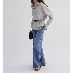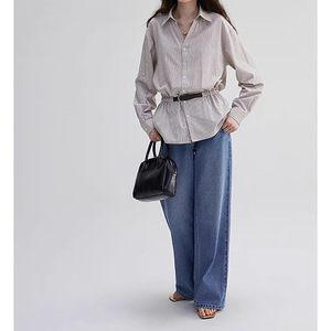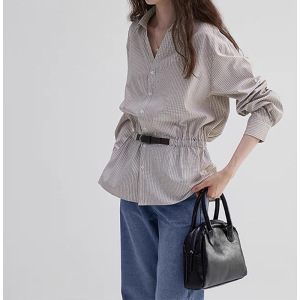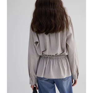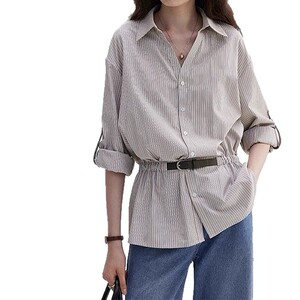 现货厂家批发 设计感V领收腰条纹宽松衬衫气质通勤掐腰上衣 女