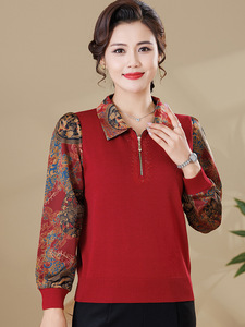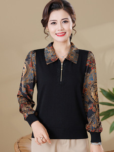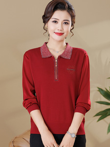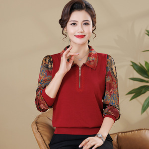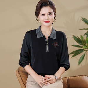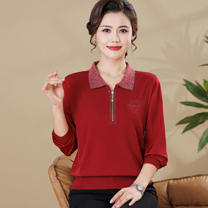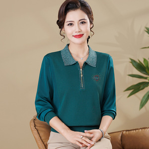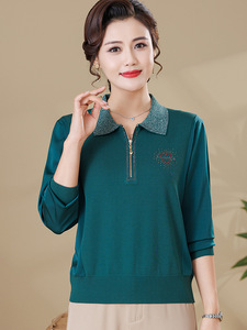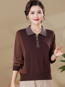中老年人妈妈女装新款针织翻领T恤长袖春秋款奶奶纱袖遮肚上衣薄