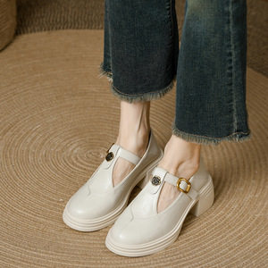 山茶花真皮复古玛丽珍丁字鞋厚底乐福鞋高跟小皮鞋气质百搭舒适