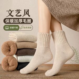 秋冬加厚保暖地板袜加绒羊毛袜子女复古针织中筒袜新款居家毛圈袜