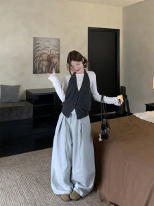 休闲套装内搭长袖针织衫叠穿挂脖背心上衣女秋季阔腿拖地裤三件套
