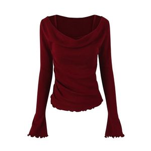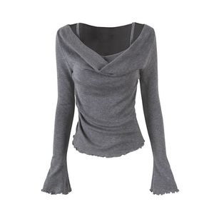 假两件露肩拼接长袖针织衫女秋冬新款修身显瘦木耳边打底上衣
