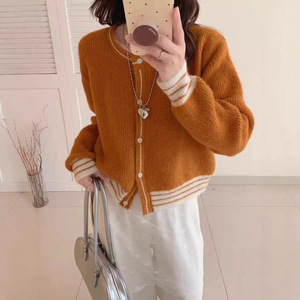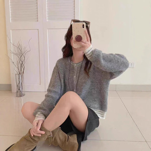 秋日慵懒!2025新款韩版减龄撞色设计感圆领宽松休闲毛衣外套女