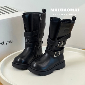 儿童皮靴迈小迈2025年秋季新款儿童时尚英伦风双皮扣骑士靴女童靴