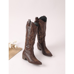法式复古尖头刺绣西部牛仔靴女2025年新款增高显瘦长筒V口骑士靴