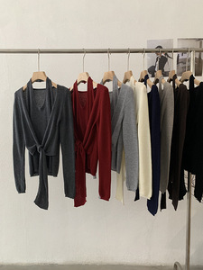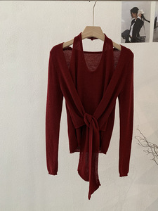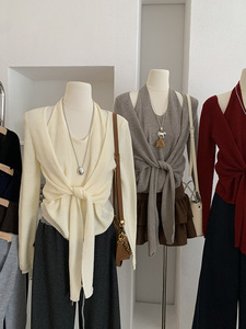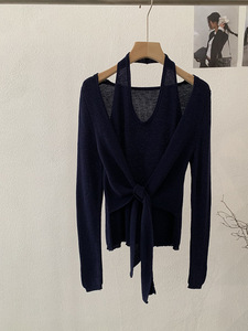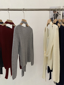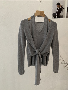 欧玛莱 拼接假两件针织衫气质秋装新款绑带挂脖长袖纯色毛衣 4777