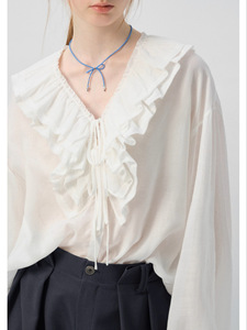 白色衬衫女2025秋季新款设计感法式V领荷叶边长袖上衣