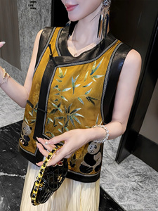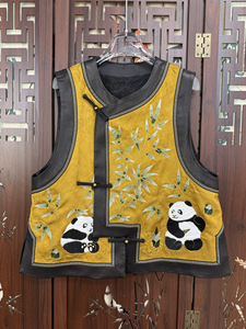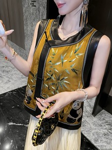 精致竹叶刺绣复古中国风圆领盘扣优雅贵气秋季无袖坎肩拼皮马甲