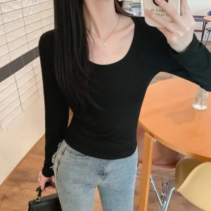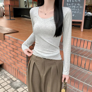 2025早秋长袖t恤女U领修身正肩纯色显瘦上衣冬季基础款内搭打底衫