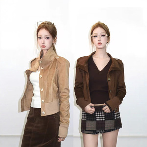 Ruanrui"古早经典”双色意大利麂皮质感显瘦短款夹克初秋外套上衣