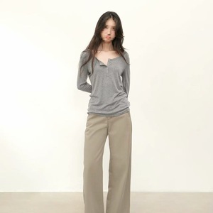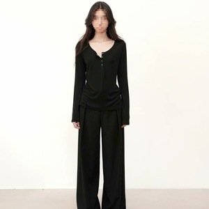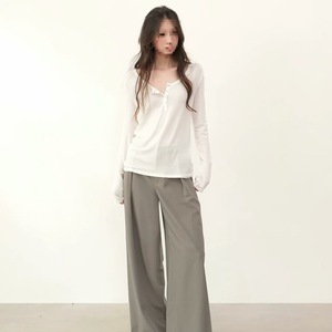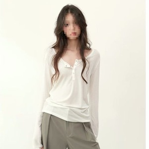天丝银扣亨利领长袖t恤女25早秋新款辣妹U领宽松显瘦薄款微透上衣
