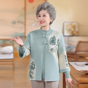 中老年人女妈妈装秋冬新中式国风外套老奶奶加绒毛衣针织两件套装