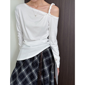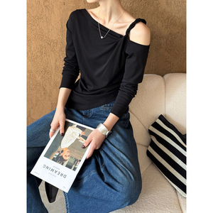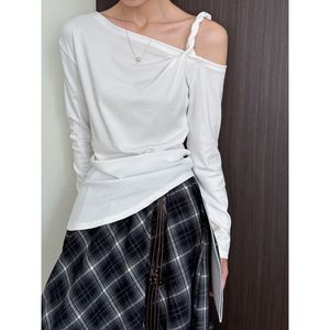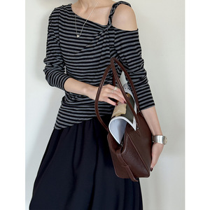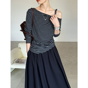 橘芷早秋新款韩系条纹长袖上衣斜肩百搭T恤修身显瘦4269