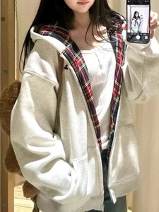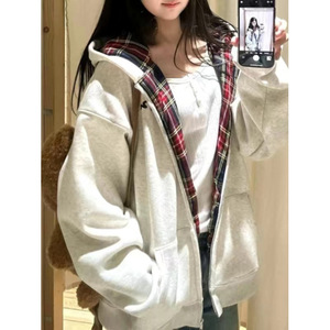 复古风连帽拉链开衫卫衣拼接2025秋冬新款格子加绒加厚休闲外套潮