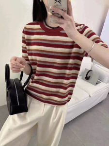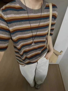 0907-141全羊毛韩系条纹撞色针织衫女早秋新款上衣短袖