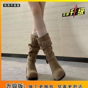拉德新款子2024夏秋季高筒靴牛仔靴长靴女美粗跟棕色显瘦堆堆西部