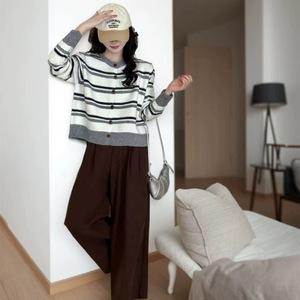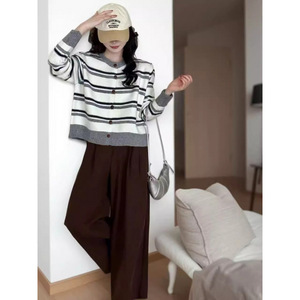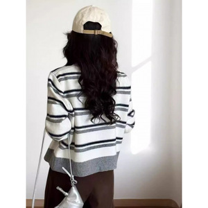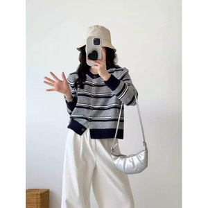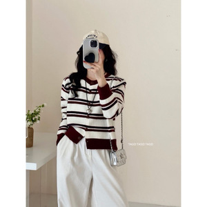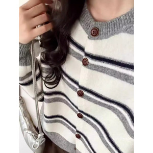 复古刺绣撞色条纹毛衣开衫外套女秋季小个子软糯宽松短款针织上衣