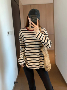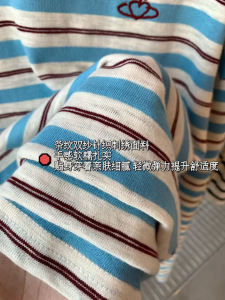 美式复古双纱针织刺绣宽松版撞色罗纹圆领落肩袖条纹T恤女秋季新