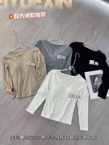 美月馨5222秋冬羊绒蛋白蕾丝V领自带胸垫磨毛打底衫