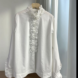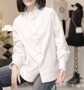 南油批发2025新款重工手工钉珠木耳边花朵棉衬衫法式减龄小衫长袖