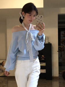 法式浅蓝色一字肩针织衫女秋冬新款设计感外搭长袖上衣薄款毛衣