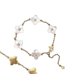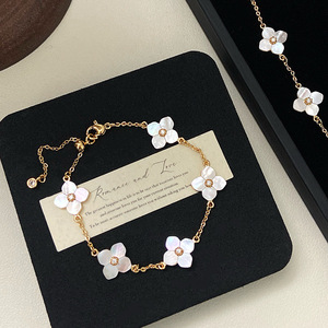 天然白贝壳四叶花花朵微镶锆石抽拉手链女铜镀真金精致轻奢手饰