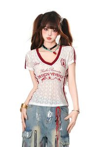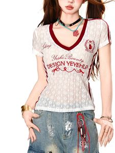复古正肩新款短袖撞色拼接辣妹绣花粉色修身美式夏季显瘦短款上衣