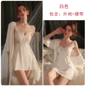 瑰若丝滑缎面低胸聚拢加胸垫吊带飞袖睡裙外袍女家居服套装M5868