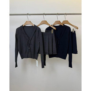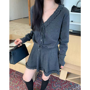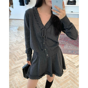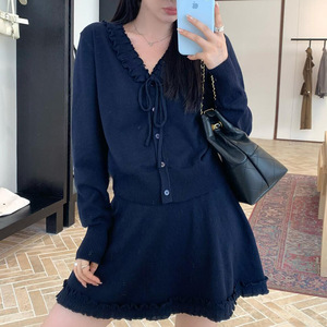 十三行2025秋季法式木耳边绑带V领针织上衣高腰A字半身裙两件套