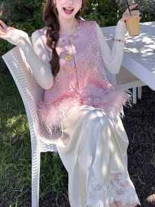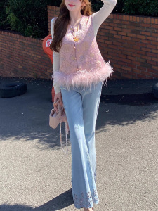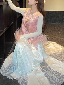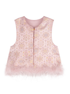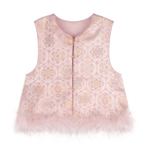 【粉金宝相】新中式国风毛毛马甲女款早秋重工粉色提花圆领上衣