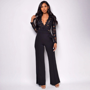 AJ4492跨境货源欧美女装 个性线条蕾丝拼接长袖休闲阔腿连体裤