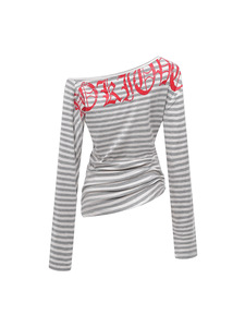美式复古条纹轻亚风辣妹斜肩秋季正反两面穿显瘦收腰百搭长袖上衣
