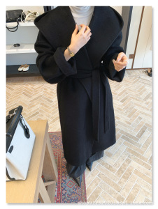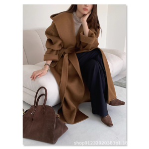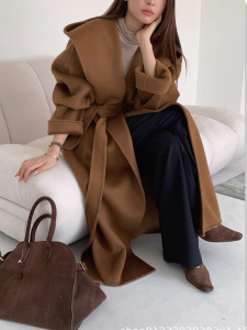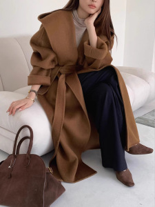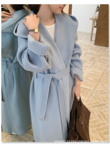 2025秋冬新款双面绒外套中长睡袍带帽款手缝羊毛呢大衣宽松系带
